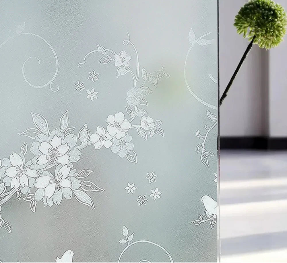 Fönsterfilm med romantiska blommor och fåglar från fonsterdekal.se. Ger en stilfull och dekorativ touch samtidigt som den skapar avskildhet.
