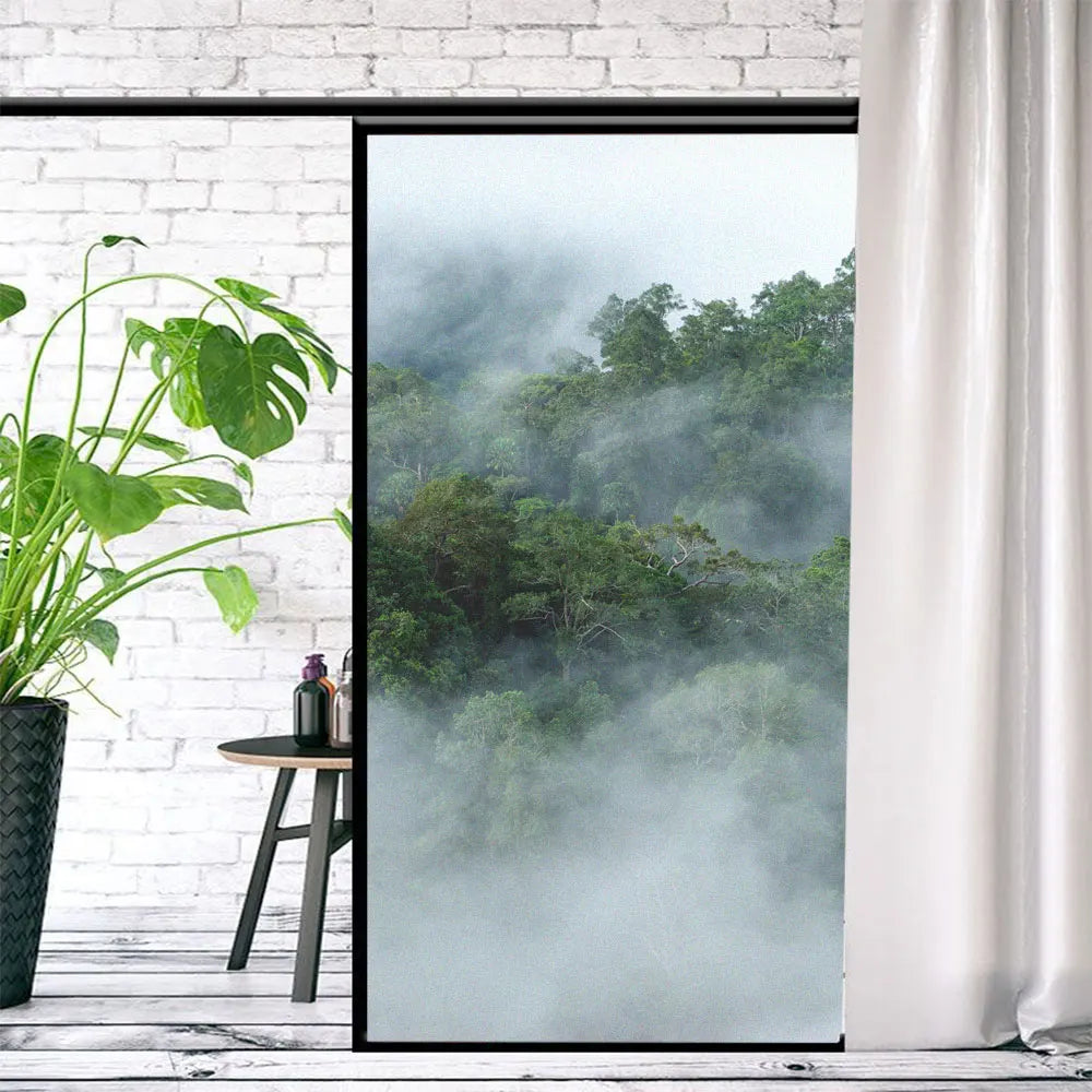 Fönsterfilm med dimmig skogsdesign