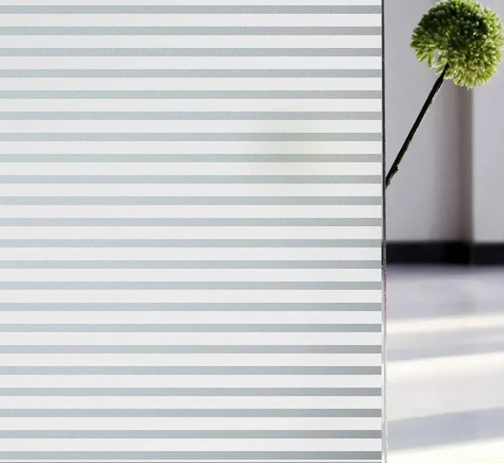 Fönsterfilm med ett stilrent randigt mönster från fonsterdekal.se. Den moderna designen med tunna horisontella linjer skapar ett elegant insynsskydd utan att blockera ljusinsläppet. Perfekt för både hem och kontor där du vill ha avskildhet utan att göra rummet mörkare.