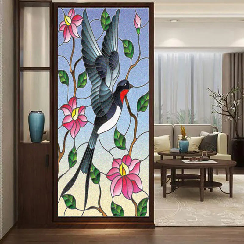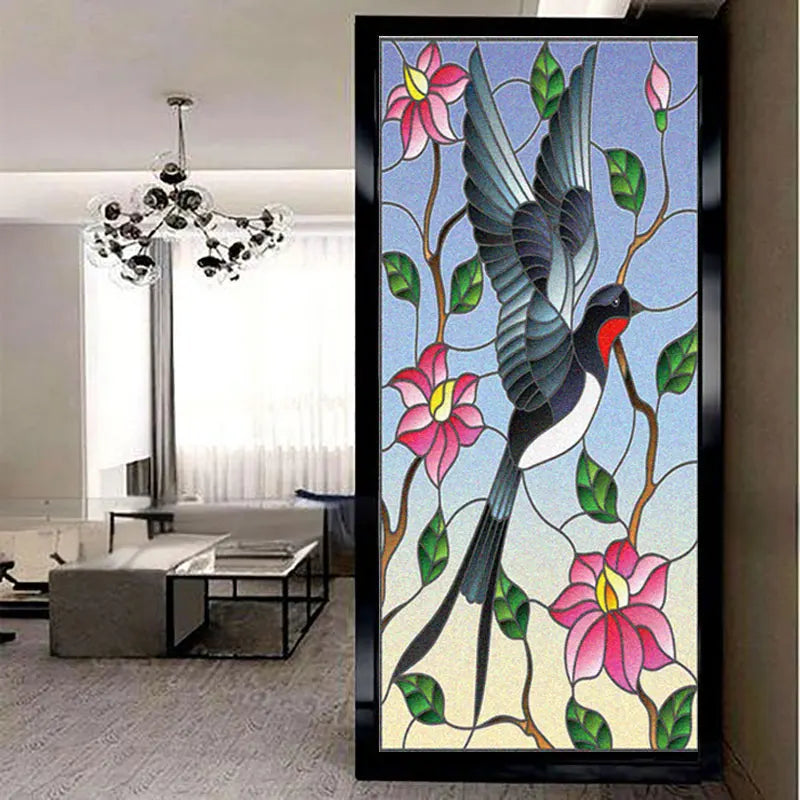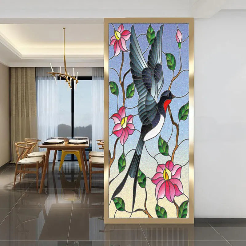 Skapa en elegant och färgstark atmosfär i ditt hem med denna fönsterfilm i glasmålningseffekt med ett vackert svalmotiv bland blommor och blad. Perfekt för att skydda din integritet samtidigt som ljuset får strömma in på ett mjukt och behagligt sätt.